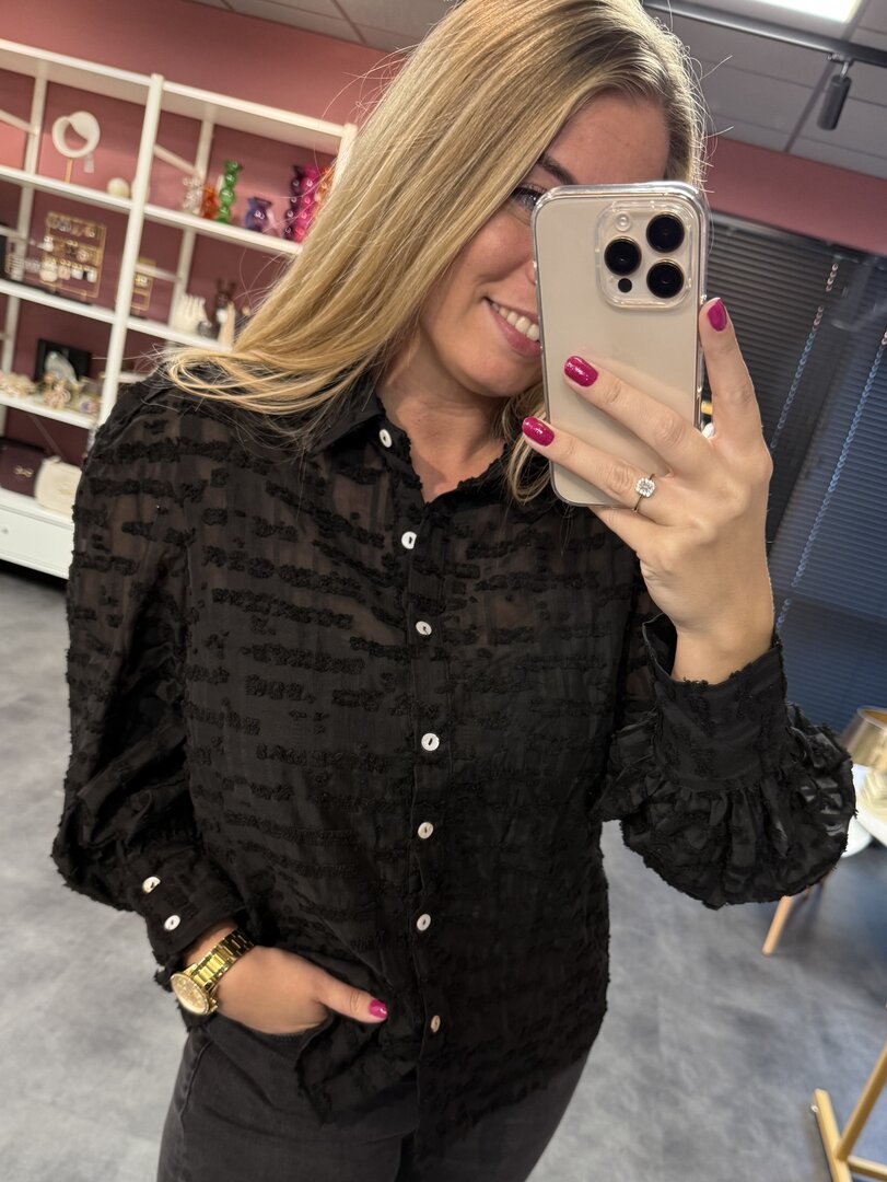 Maat model: 1.68cm lang en draagt normaal maat L/40. Draagt de blouse in maat L.