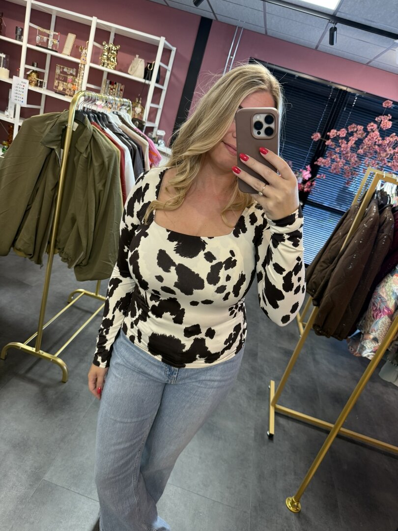 De By Swan top met koeienprint is een echte eyecatcher! De top heeft een mooie vierkante hals en de top heeft stretch.