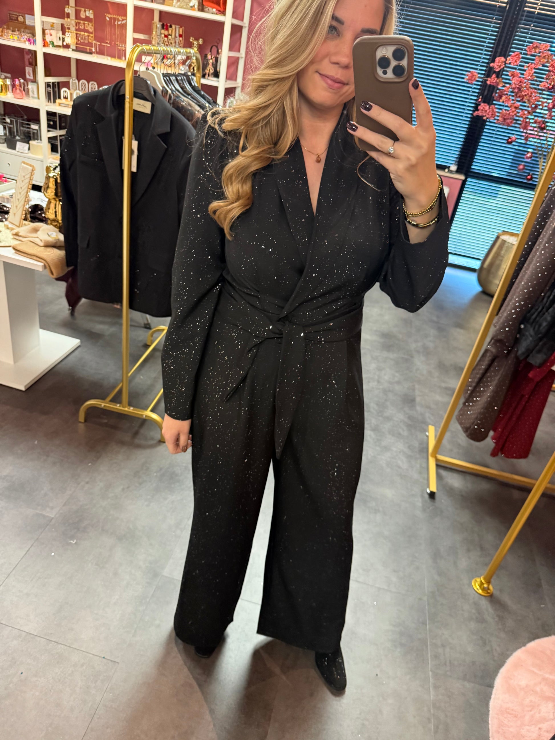 Zoek niet verder! De perfecte party look creëer je met deze geweldige jumpsuit! Deze mooie zwarte jumpsuit heeft prachtige glitters, gedetailleerd met elastiek in de taille, een mooie V-hals en wijde pijpen.
