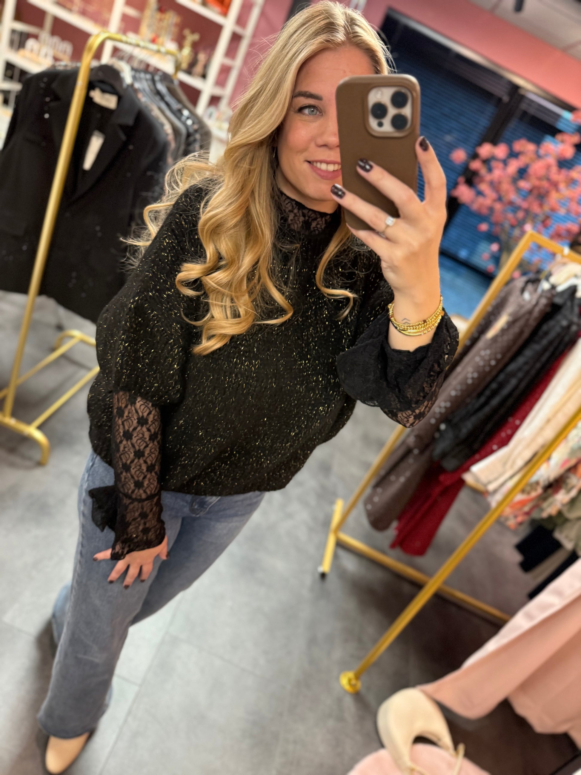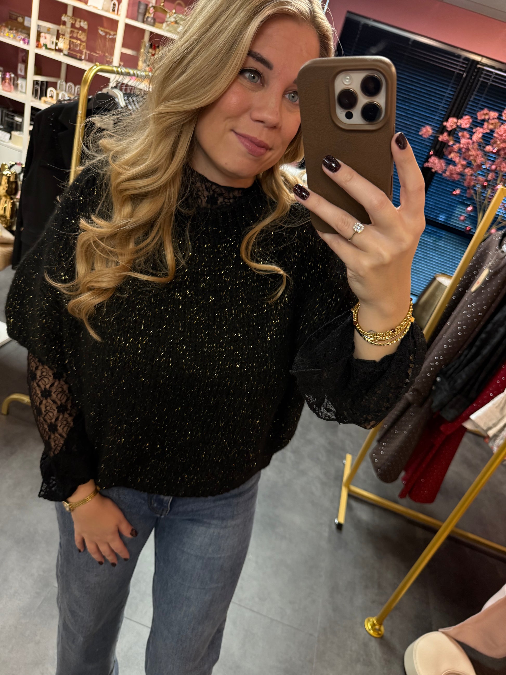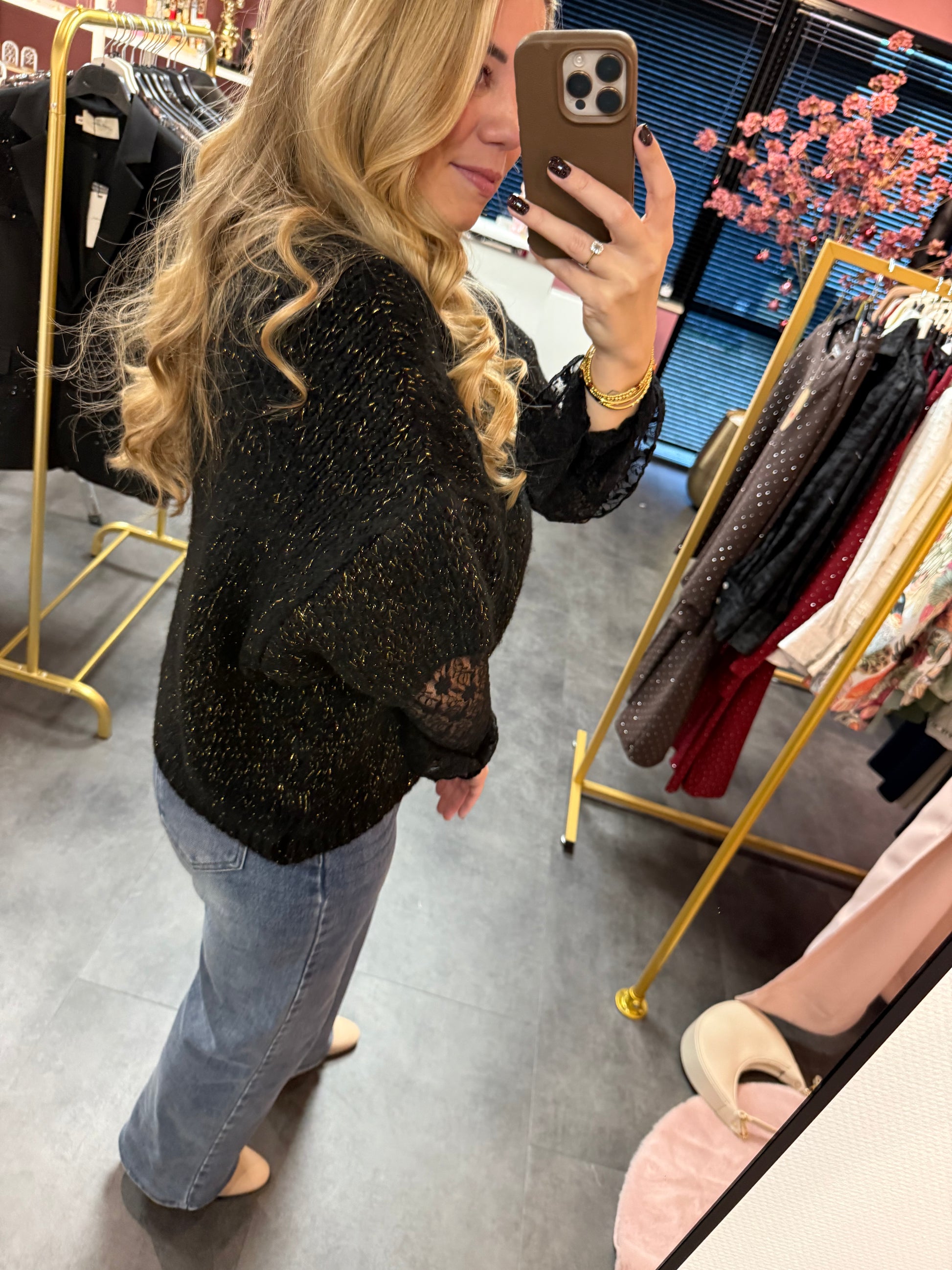 Een zachte knit van Ambika met Gouden glitterdraad voor een chique maar casual uitstraling. De trui heeft driekwart mouwen en is daarom erg geschikt om te combineren met de Ambika kanten top met flared mouwen.