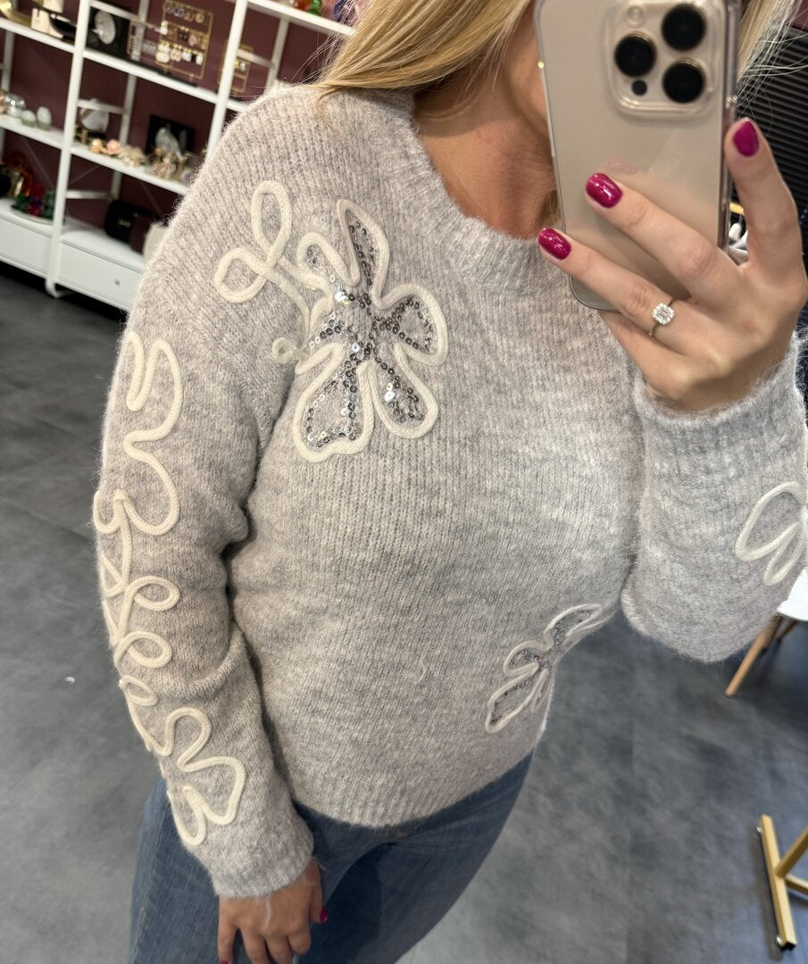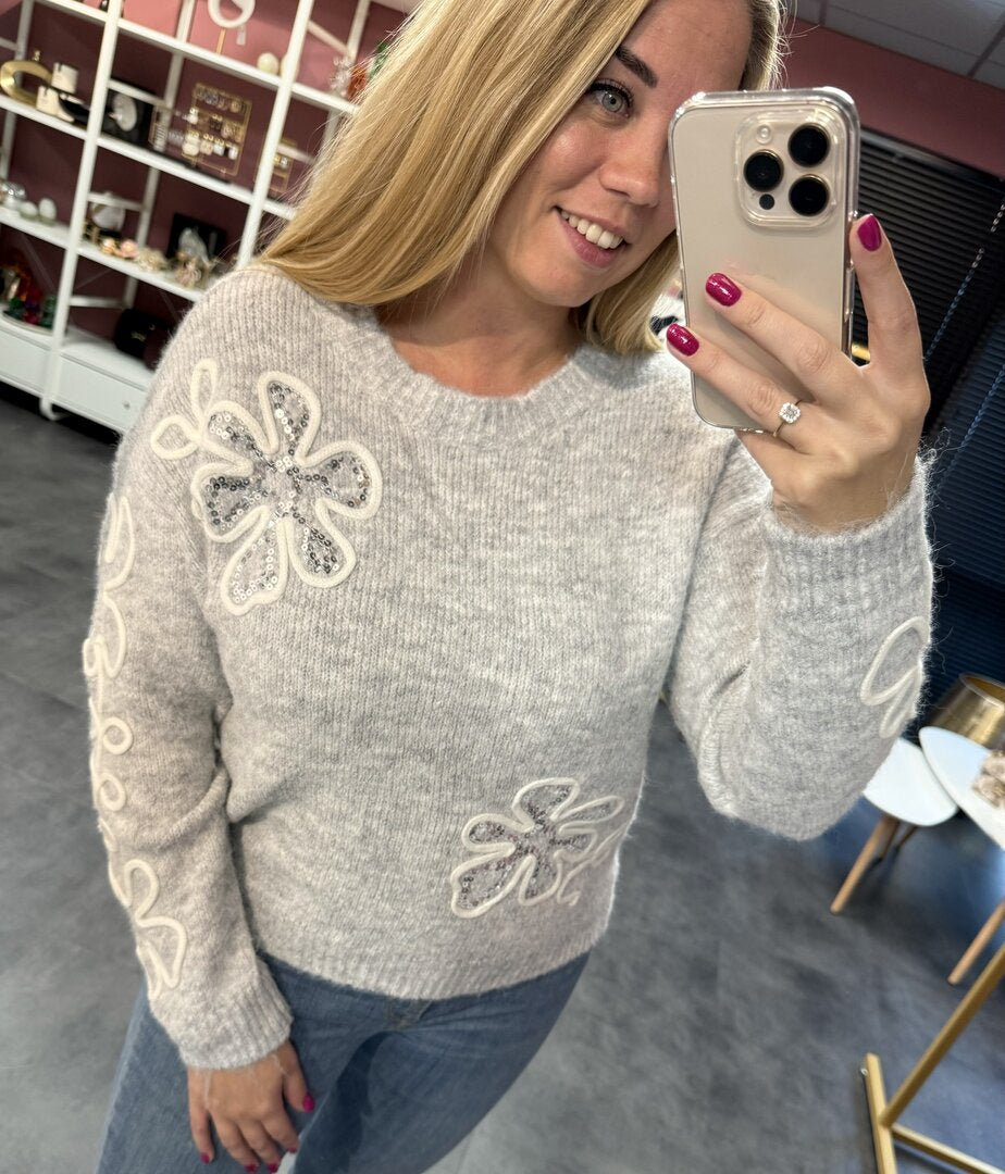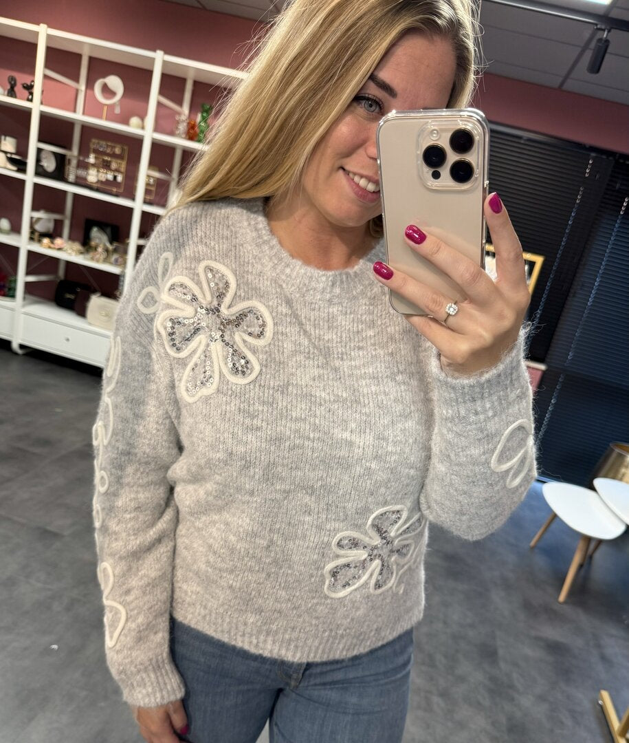 Deze leuke trui flora heeft een leuke licht grijze kleur, bloem borduursels en pailletten.