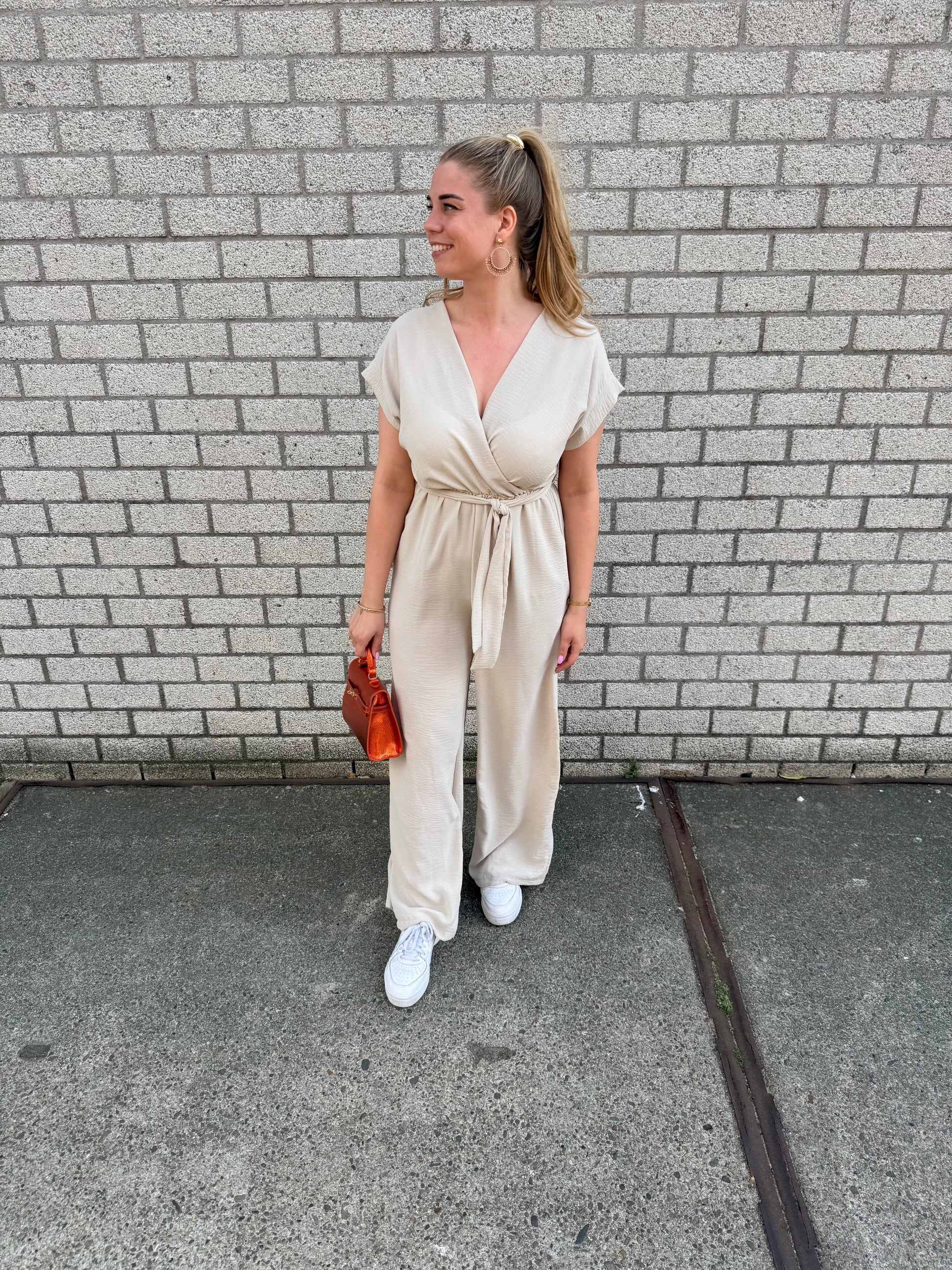 De beige jumpsuit biedt veel voordelen voor de moderne vrouw. Met zijn subtiele tint en mooie lengte is dit hét luchtige pak dat je iedere dag wilt dragen. De vrouwelijke ceintuur in de taille zorgt voor een elegante, flatterende pasvorm.