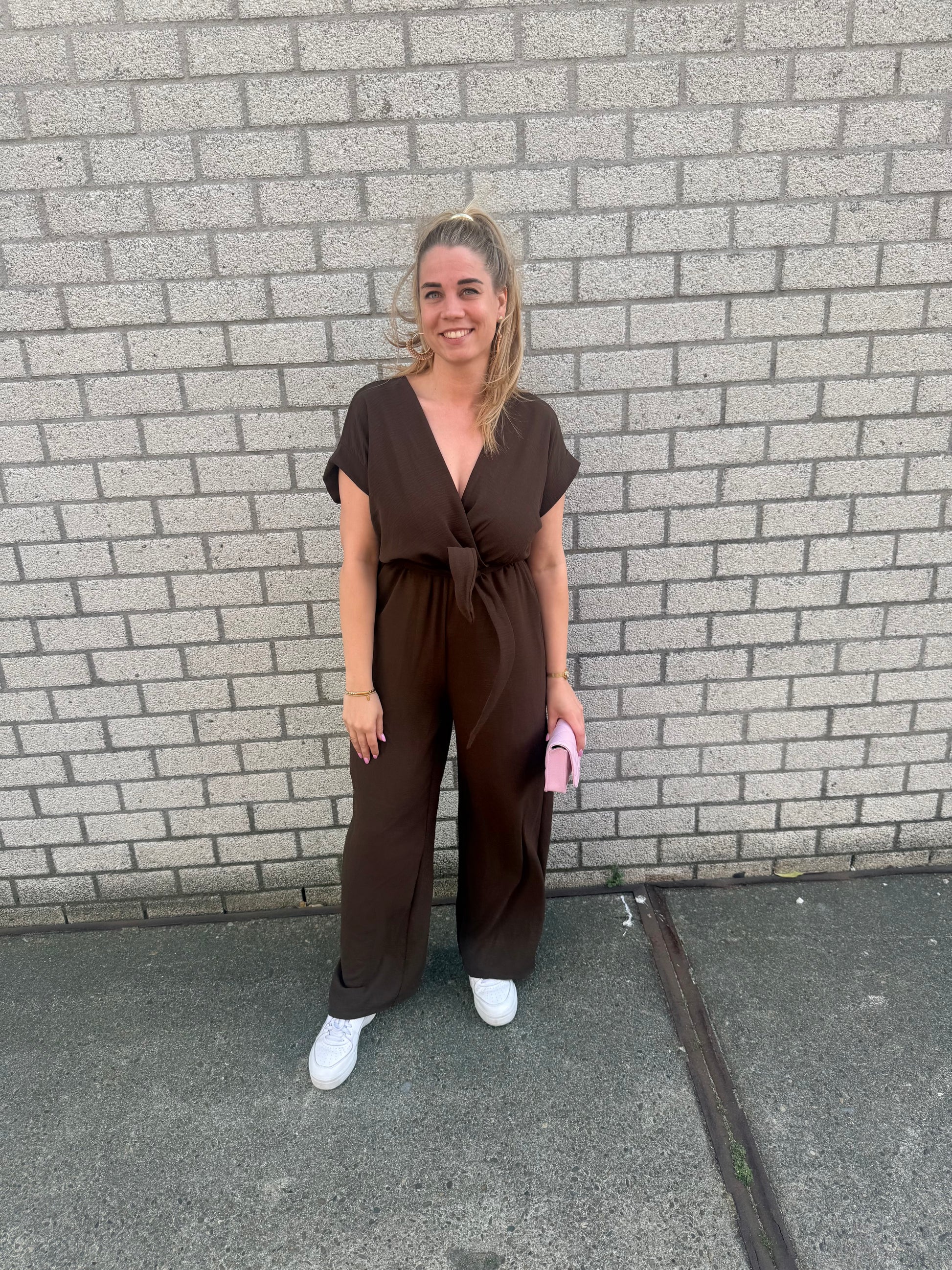 De bruine jumpsuit biedt veel voordelen voor de moderne vrouw. Met zijn subtiele tint en mooie lengte is dit hét luchtige pak dat je iedere dag wilt dragen. De vrouwelijke ceintuur in de taille zorgt voor
