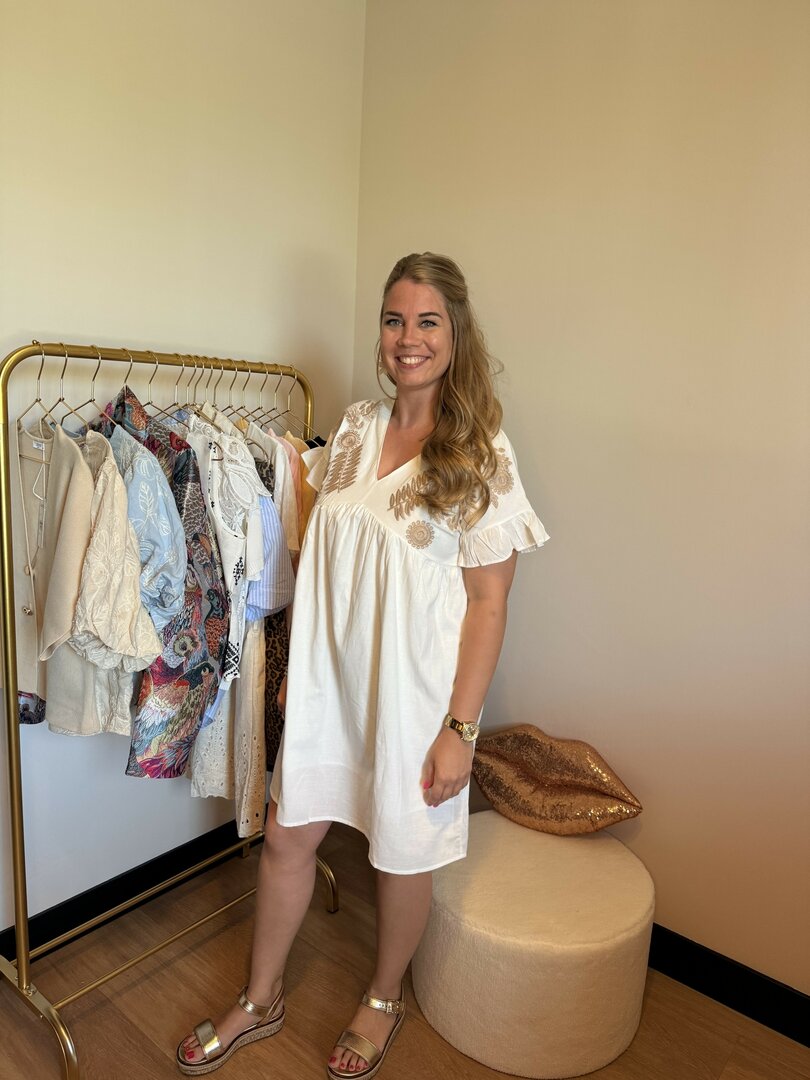 En heb je de mooie beige borduursels al gezien op de jurk?