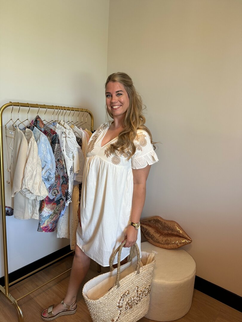 Dit witte jurkje geeft je een heerlijke zomerse boho look! De jurk valt mooi bij je schouders en vanaf de borsten heeft de jurk een losvallende pasvorm.