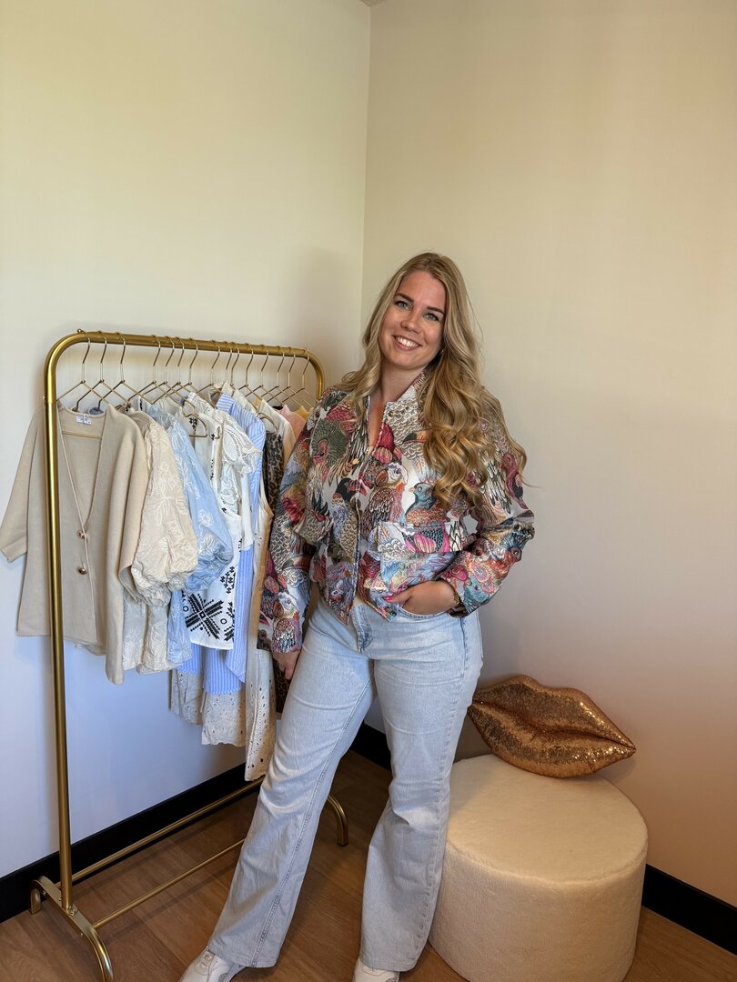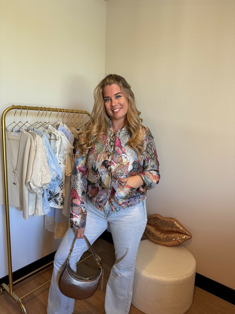 Deze toffe bomberjack met kleurrijke jacquard stof en prachtige vogelprint is echt de BOMB!