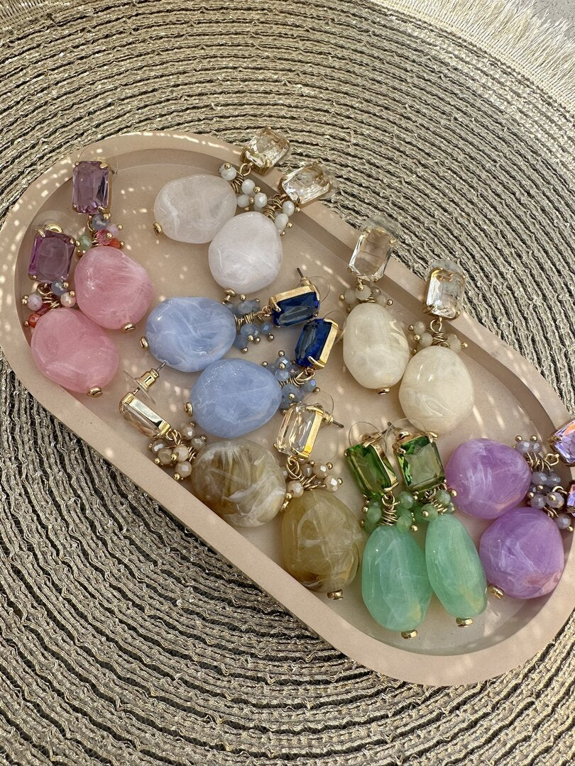 Prachtige oorbellen met een mooie crème kleurige steen, diamant en leuke gekleurde kraaltjes.