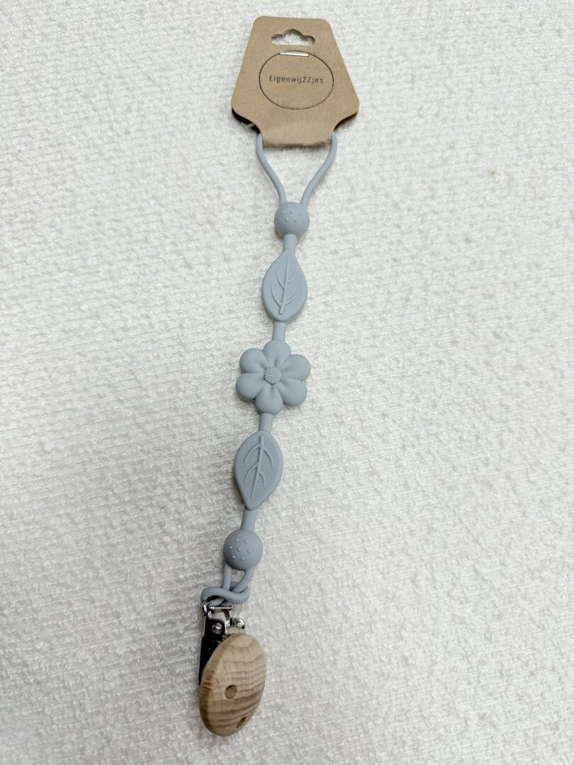 Een leuke speenkoord van het merk Eigenwijzzjes, de speenkoord is in de kleur lichtblauw met bloem en bladeren.
