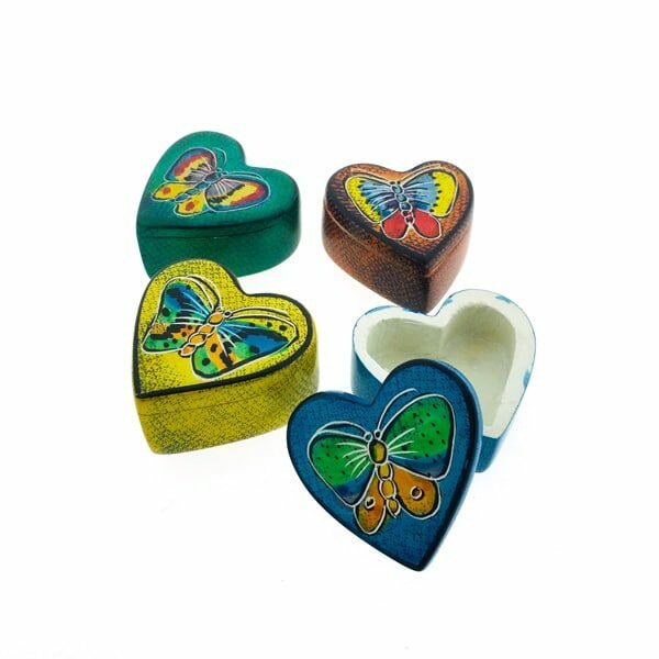 Een mooi handgemaakt speksteen opbergdoosje in de vorm van een hart met de afbeelding van een vlinder erop. De speksteen is handgemaakt ui Kenia en heeft een uniek. Verkrijgbaar in 4 kleuren.