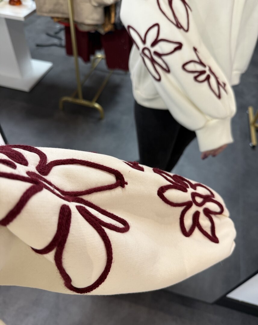Mooie sweater met bordeaux rode borduursels op de mouwen