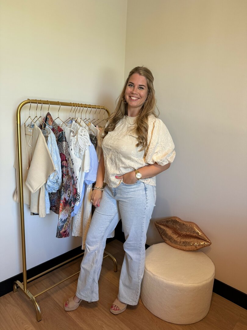 De pofmouwen geven een speelse en verfijnde uitstraling.