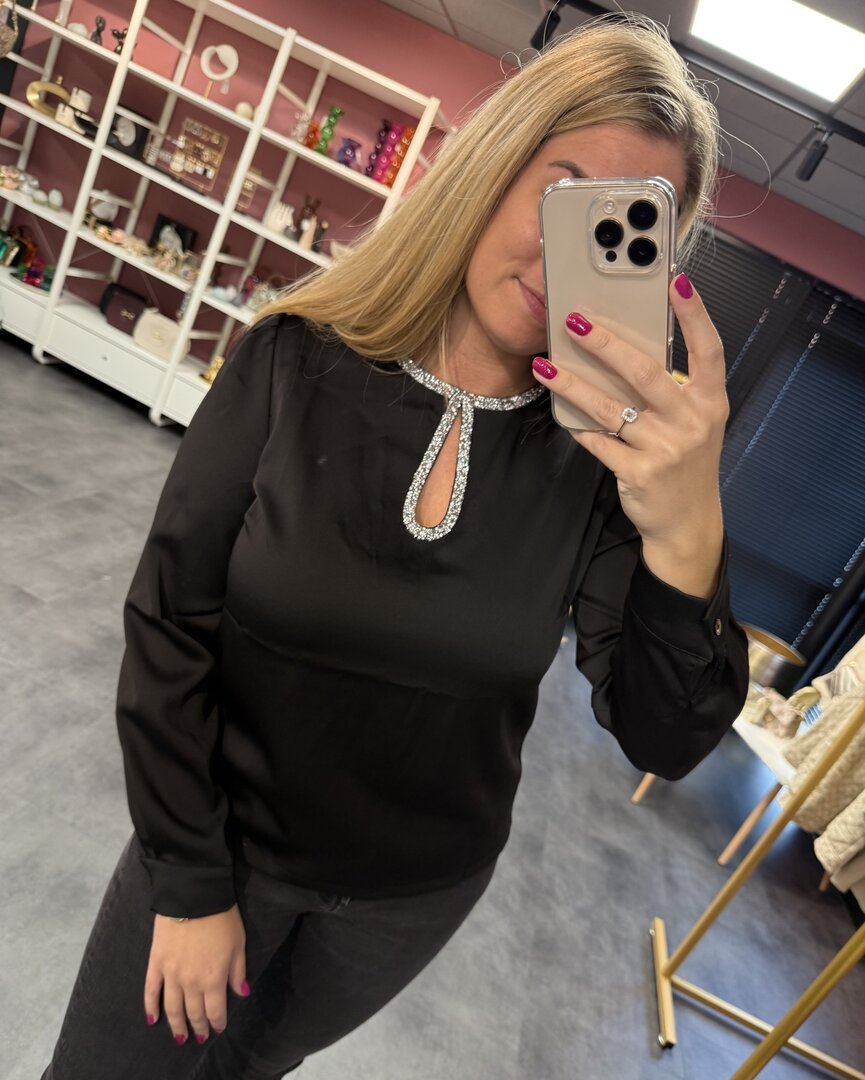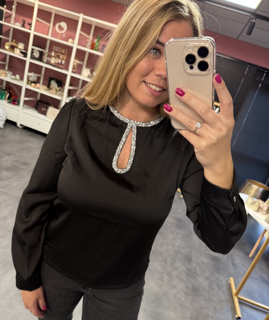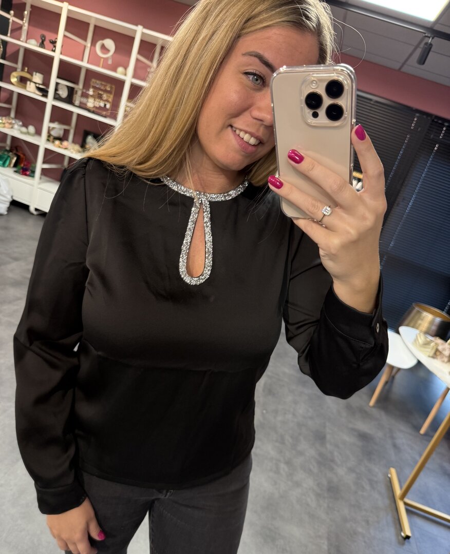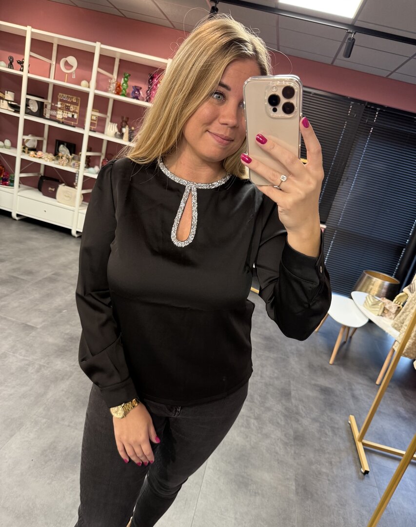 Top Shine is een mooie zwarte top met een prachtig halsje. Leuk voor een feestje.